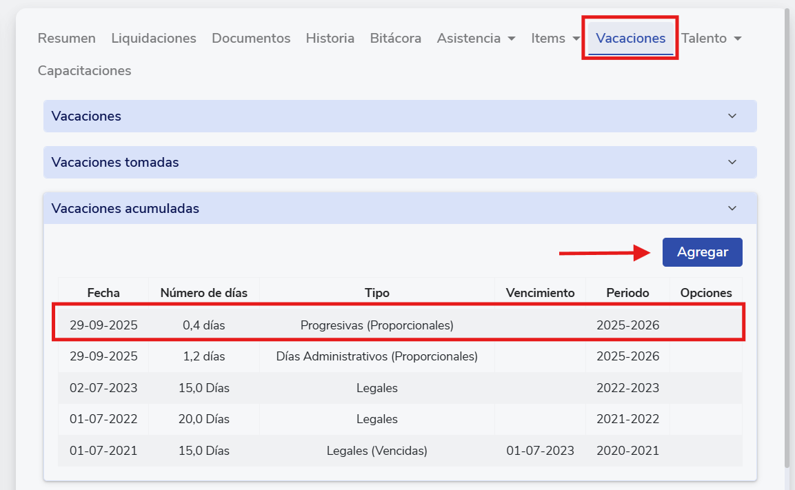 En caso que el colaborador ya tenga un saldo anterior puedes agregarlo desde su Ficha del colaborador, en su pestaña de "Vacaciones" en la sección de "Vacaciones Acumuladas", una vez allí presiona "Agregar", selecciona en "Tipo vacación" la opción de "Progresivas" y rellena la información de la fecha de asignación y la cantidad de días a cargar, considera estos días se sumarán a los ya calculados por Buk (proporcionales).