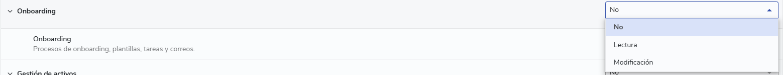 Si el perfil tiene la acción Modificación, la persona puede gestionar completamente el módulo. Esto incluye crear, editar, eliminar y administrar procesos, plantillas y demás elementos de Onboarding.