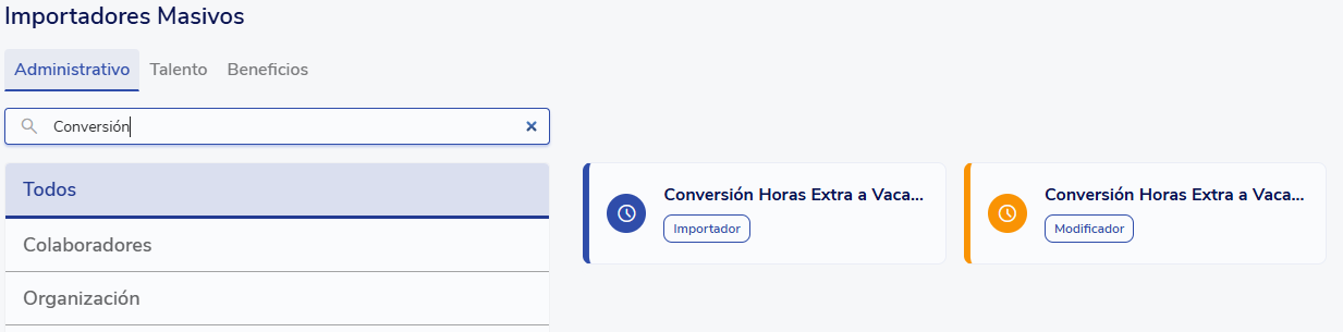 Dirígete al menú lateral Información, sección Importadores, y luego Importadores. Escoge el importador Conversión Horas Extras a Vacaciones (Importador), selecciona el periodo en el que se hicieron las horas extras que vas a convertir y descarga la plantilla.