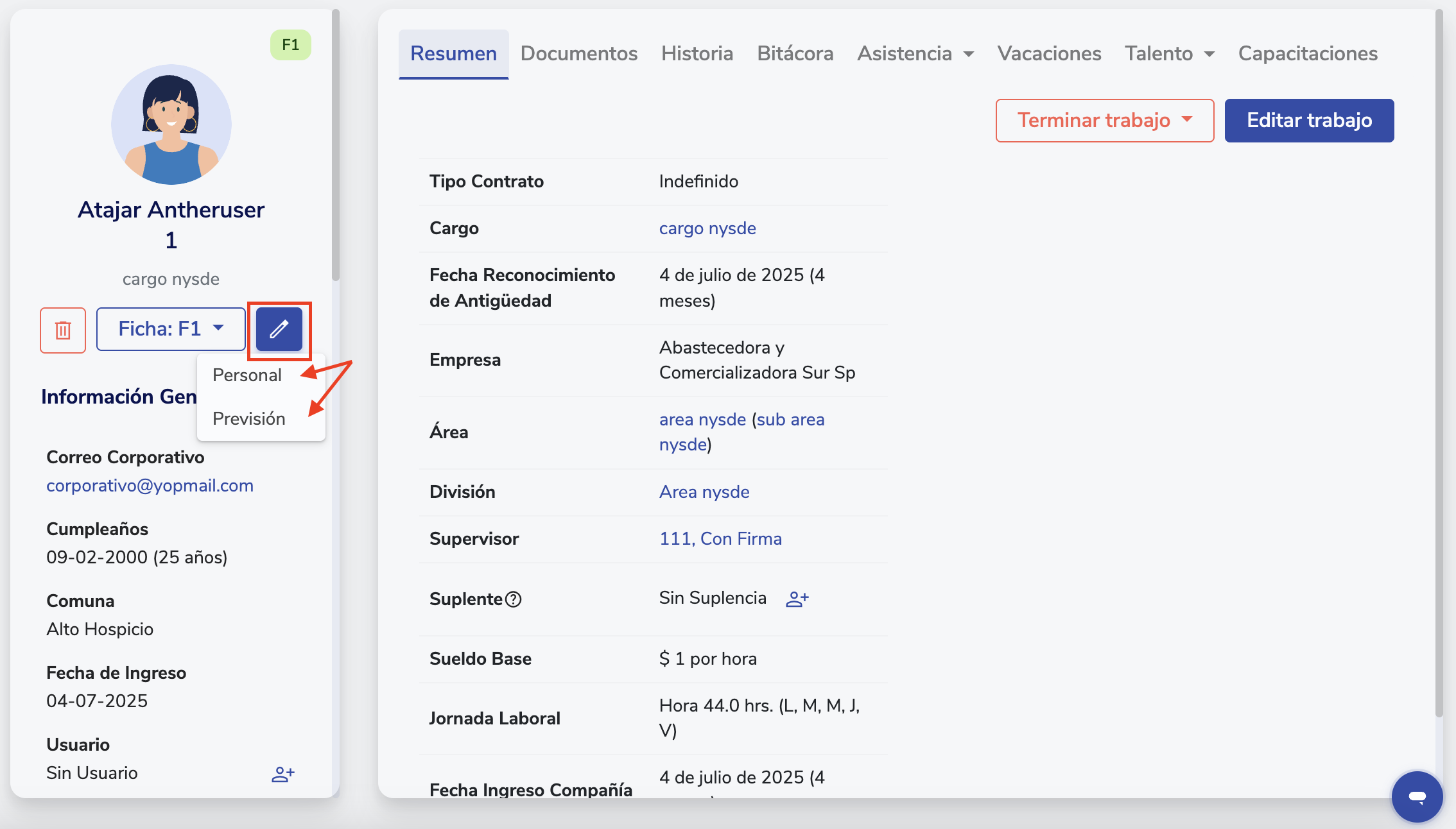 Una vez en la ficha, debes seleccionar el botón del lápiz y seleccionar que tipo de dato es que quieres editar entre personales y previsionales.