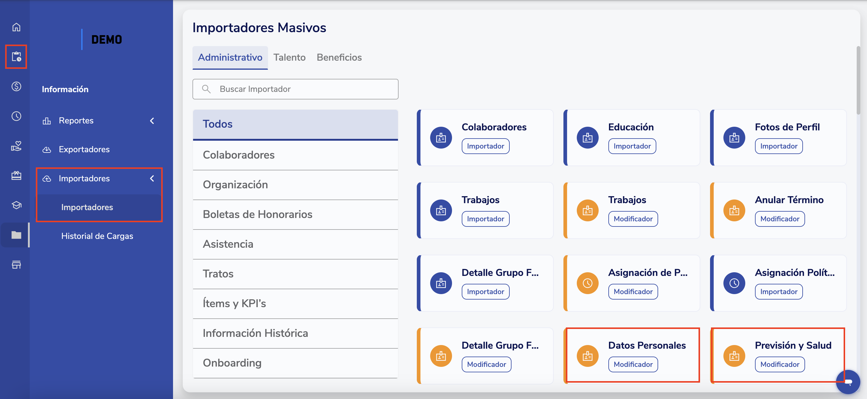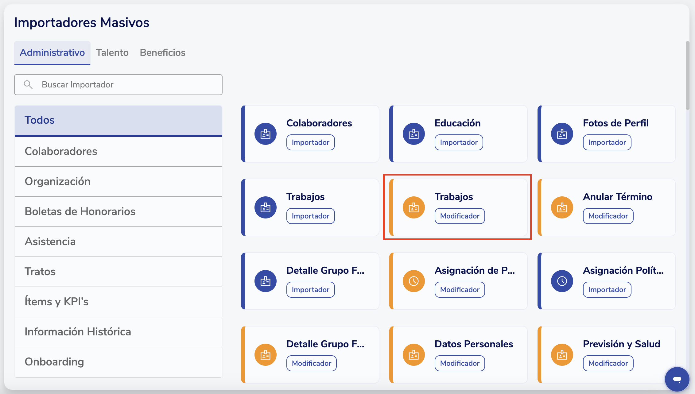 - Importadores: Herramienta capaz de cargar datos masivamente en la plataforma, facilitando la carga o actualización de información referente a los colaboradores, trabajos o empresas.