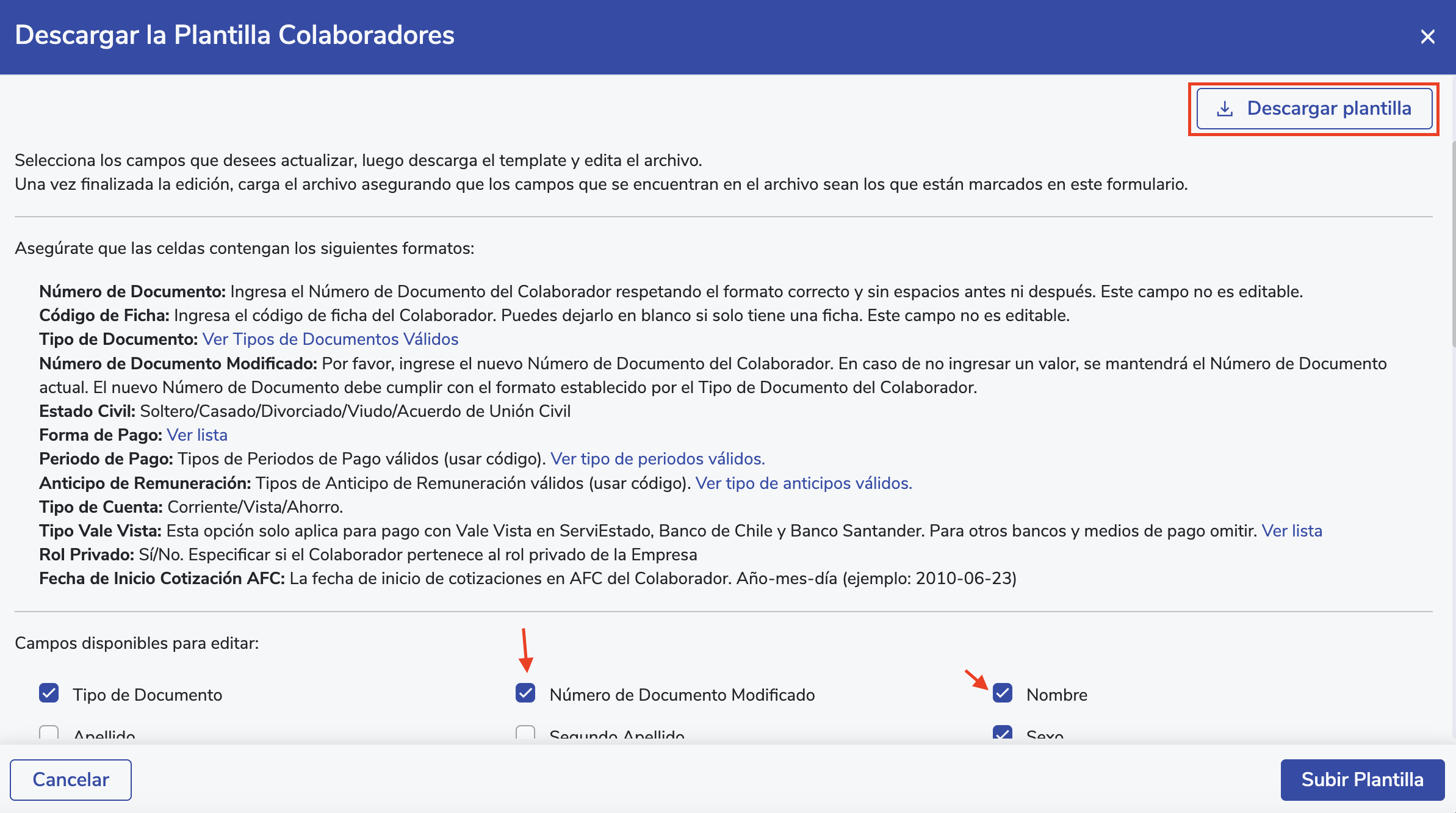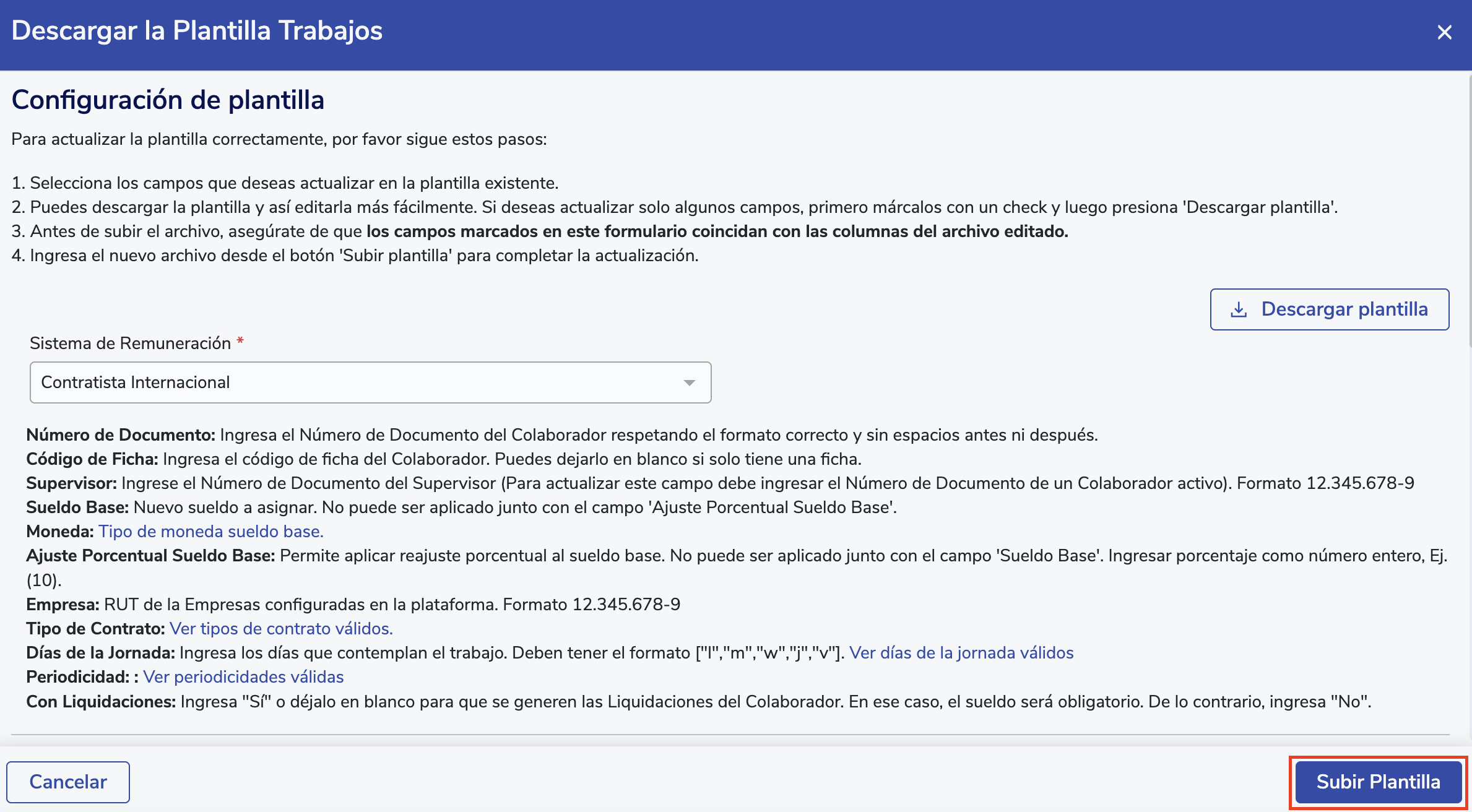 Una vez seleccionado el sistema de remuneración, se te desplegara una lista con los campos a seleccionar, donde deberás elegir aquellos que necesites editar. Luego, puedes descargar el template con el botón "Descargar plantilla" para realizar todos los cambios que necesites en el excel y luego subirlo con el botón subir plantilla.