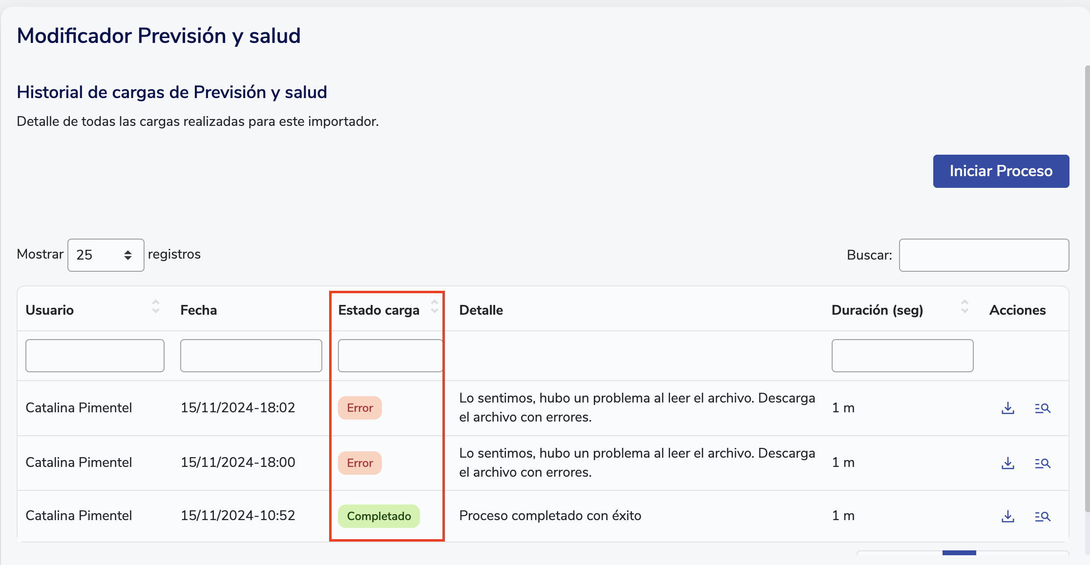 Una vez subida la plantilla, podrás ver el estado de carga de tu archivo donde podrás validar si se subió correctamente o no.