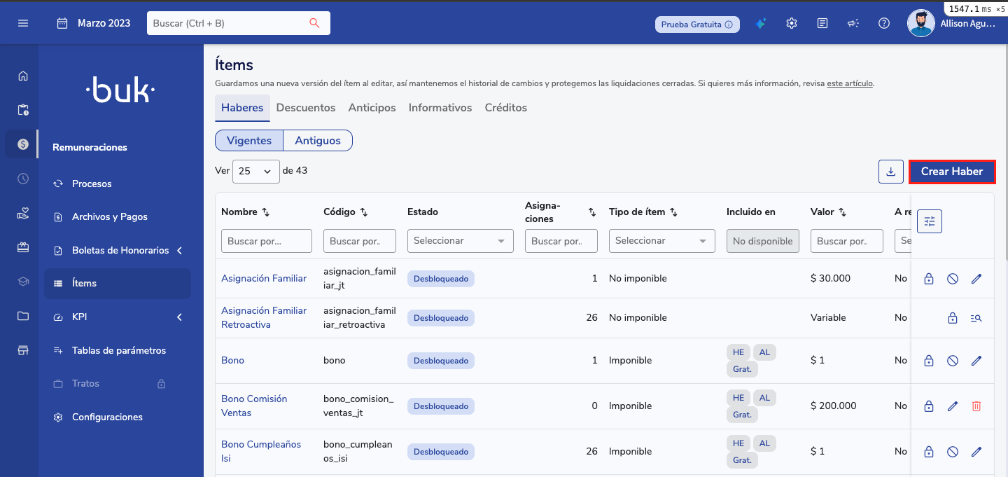 1. Asignación de items: estos son todos los haberes y descuentos que componen la liquidación, si necesitas incorporar algun ítem puedes crearlos de forma individual y masiva, revisemos el paso a paso a continuación: