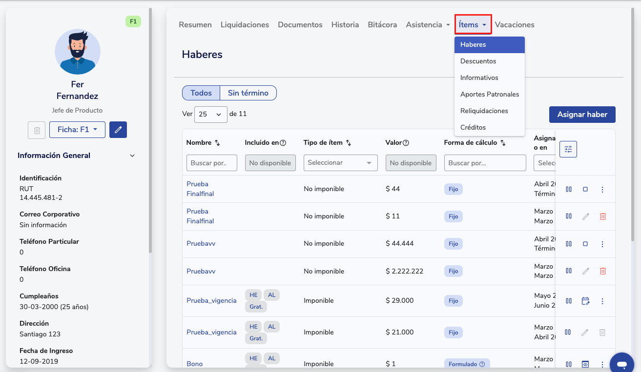 Una vez tengas creados los items deberás asignarlos a los colaboradores o verificar si todos cuentan con las asignaciones correspondientes al mes, para ello puedes descargar un exportador personalizado desde nómina o ir a la ficha en la sección de items y comprobarlo.