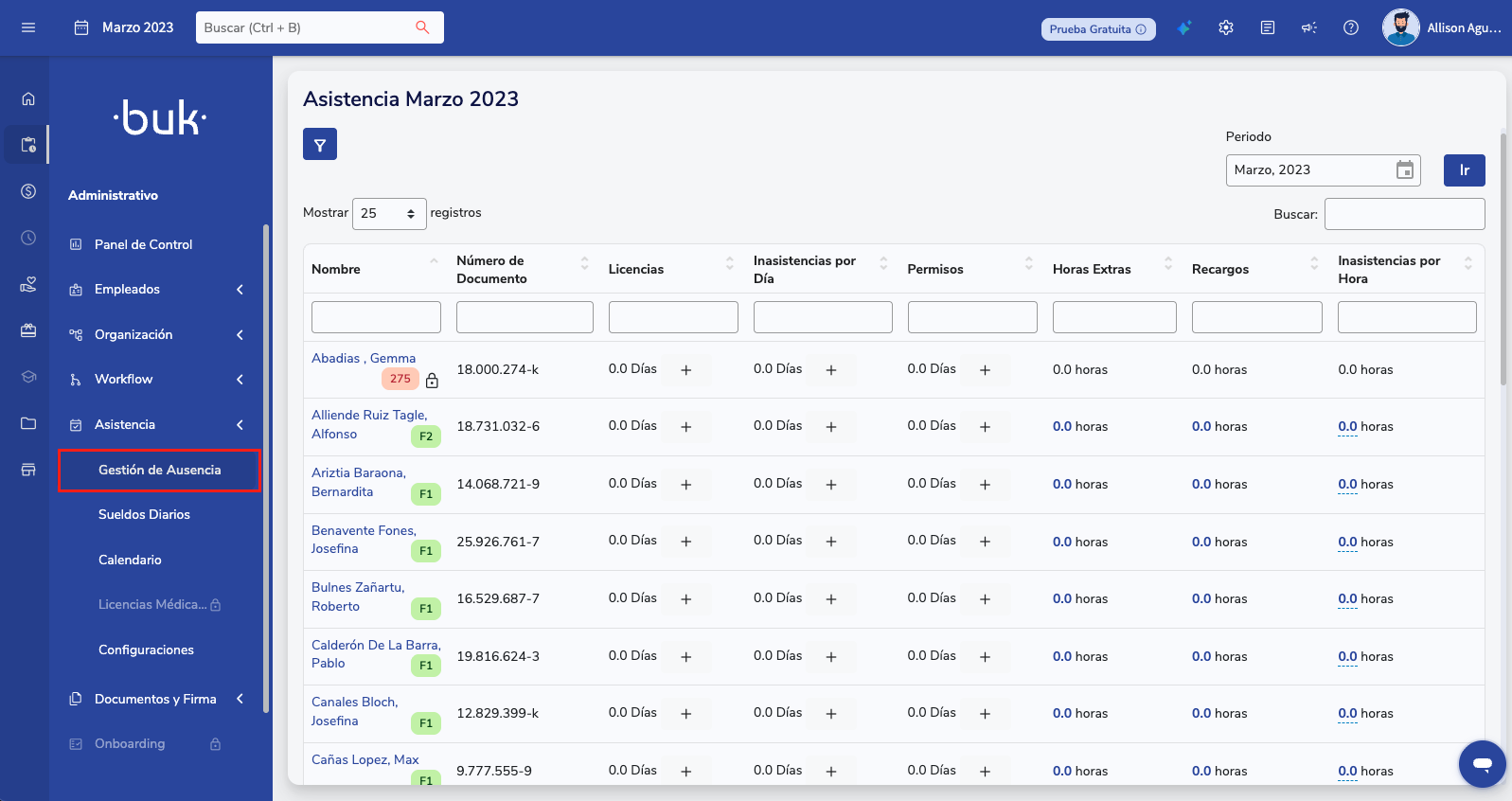 2. Revisa la asistencia de los colaboradores: deberás ingresar todo lo relacionado a horas extras, licencias, ausencias, permisos, entre otros que puedan afectar los días trabajados y las liquidaciones. Para ello podrás hacerlo desde la ficha de los colaboradores o directamente desde el menu lateral >> asistencia >> Gestión de Ausencia. En esta sección deberás cargar todo lo relacionado al registro de asistencia lo cual permitirá calcular los días efectivamente trabajados.