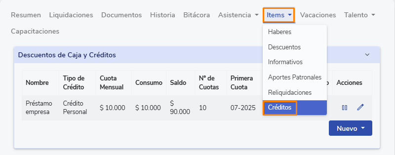 Para comenzar, dirígete a la ficha del colaborador, a la pestaña "Ítems", desde donde puedes acceder a "Créditos". Aquí, encontrarás la opción de "Descuentos de Caja y Créditos", que te permitirá crear un nuevo crédito o descuento de caja y así asignarlo directamente al colaborador.