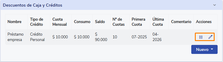 Caja de compensación, créditos, prepagar, editar, suspender, cuota actual, cuota final, Previred, CCAF, tipo de crédito, crédito empresa, préstamo, adelanto, otros descuentos, sobregiro.