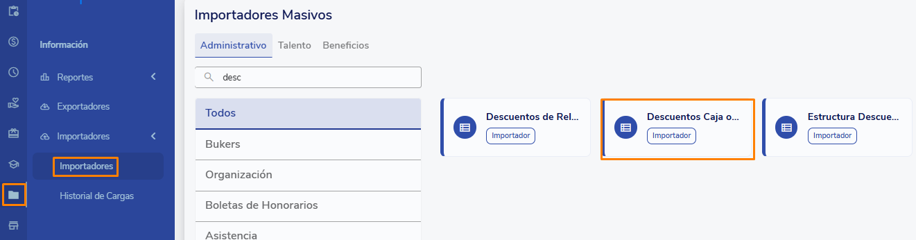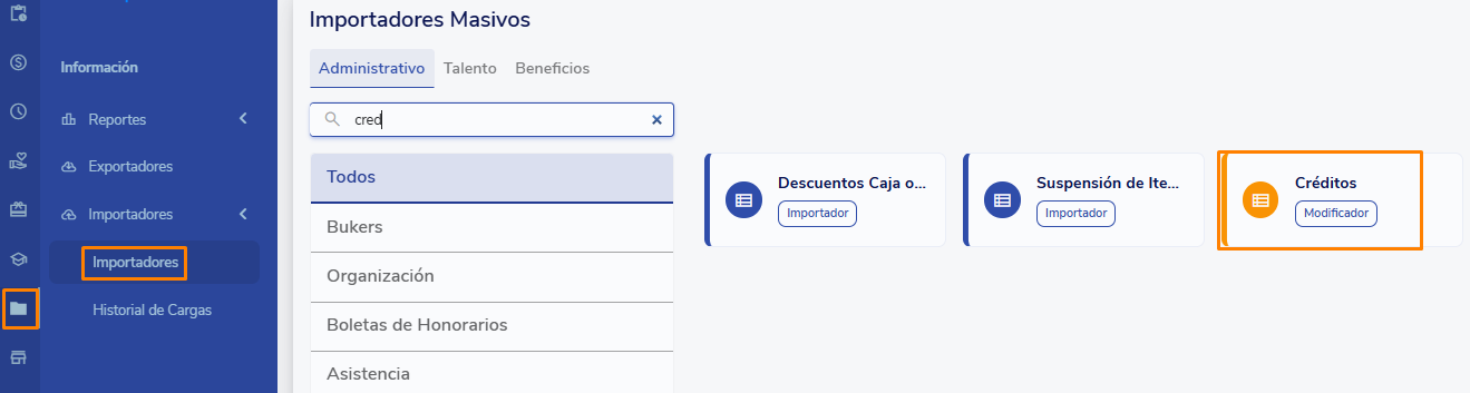 Desde "Información", presiona "Importadores" y luego "Importadores", allí ubica el importador de "Descuentos Caja o Créditos" y selecciona el origen: "Descuentos de Caja" u "Otros Créditos".