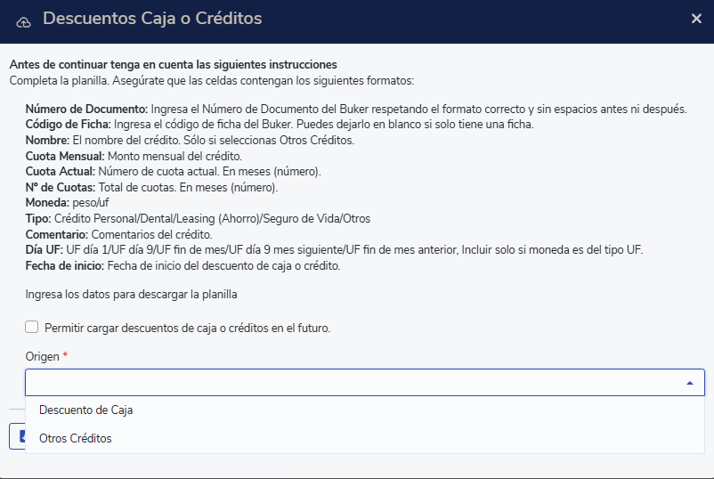 Una vez revisadas las instrucciones, descarga el template, rellena la información y sube el archivo desde "Seleccionar Archivo". Al completarse la carga habrás cargado tus créditos y descuentos de caja de forma masiva.