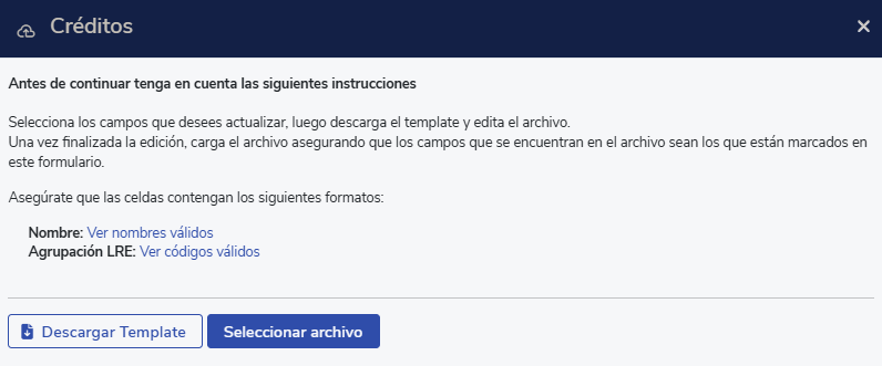 Una vez revisadas las instrucciones, descarga y completa el archivo para luego subir el template desde "Seleccionar Archivo". De esta manera podrás editar masivamente créditos ya creados/asignados.