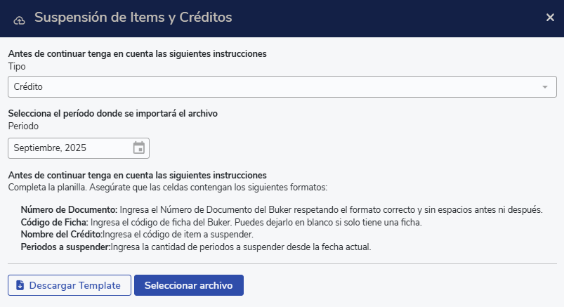En las instrucciones de carga se especifica que en el template deberás completar la información del Número de documento, Código de Ficha, nombre del crédito y períodos a suspender. Además, debes escoger el periodo en el cual se harán efectivos los cambios.
