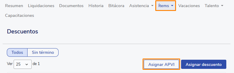 Para gestionar un APV Individual, comienza accediendo a la ficha del colaborador. Una vez dentro, dirígete a la pestaña "Ítems" y seguidamente haz clic en "Descuentos". Dentro de "Descuentos", encontrarás el botón "Asignar APVI":