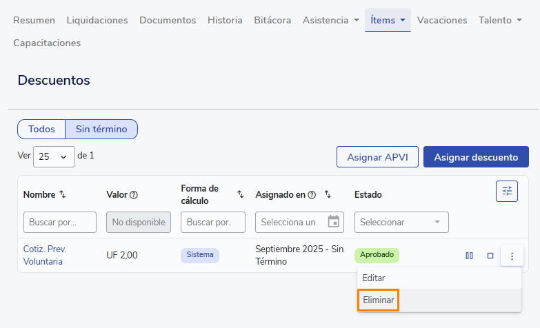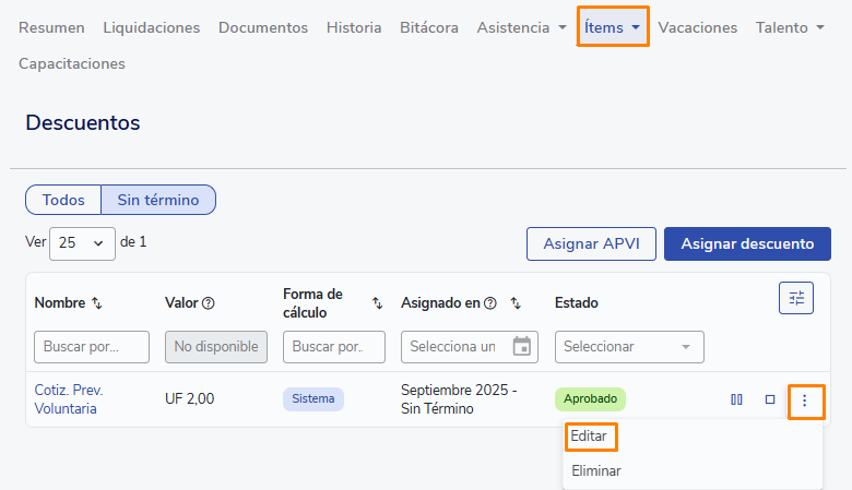 En ese recuadro encontrarás todos los APVs y descuentos asignados. Si deseas editarlo presiona sobre los 3 puntos y haz clic en Editar.