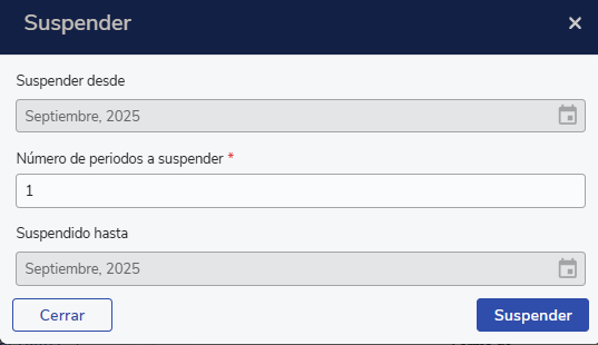 Si deseas suspender el APV de forma individual podrás hacerlo desde el ícono de pausa (⏸️) e indicando la cantidad de meses a suspender. Una vez definido presiona "Suspender" para guardar los cambios.