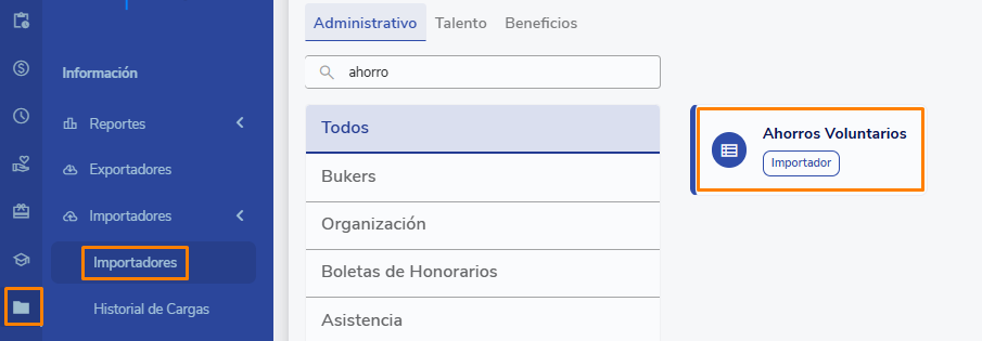 Para realizar una carga masiva de APVI en la plataforma, comienza accediendo al menú lateral Información, sección Importadores y, dentro de ella, haz clic en la opción Importadores. Una vez allí, presiona sobre el importador de "Ahorros Voluntarios". Al realizarlo, encontrarás la sección "Ahorro a Cargar" donde deberás seleccionar "APVI".
