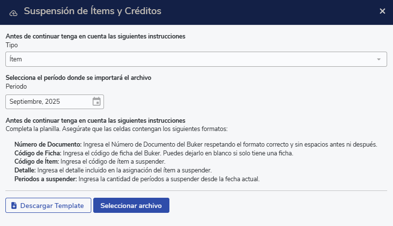 En la casilla "Tipo" selecciona la opción de "Item". Luego descarga y rellena el template con los datos del RUT de colaborador, su código de ficha, el código del ítem, y los períodos a suspender. Una vez listo sube el template desde "Seleccionar Archivo" para suspender masivamente.
