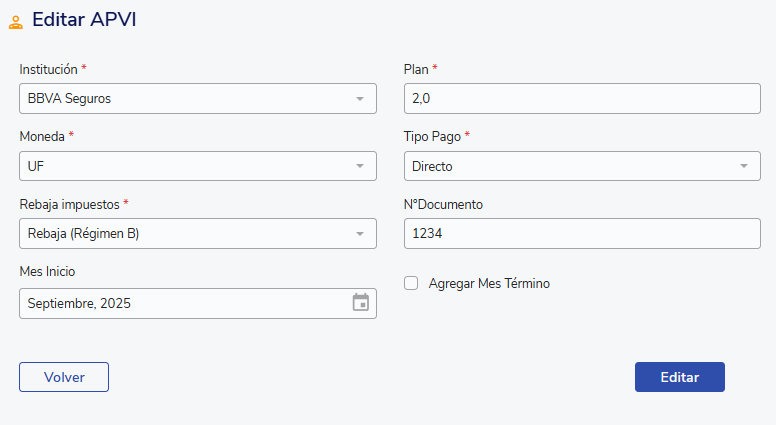 - Agregar Mes Término: Al marcar esta casilla podrás establecer el mes en que finalizará la asignación del APV.