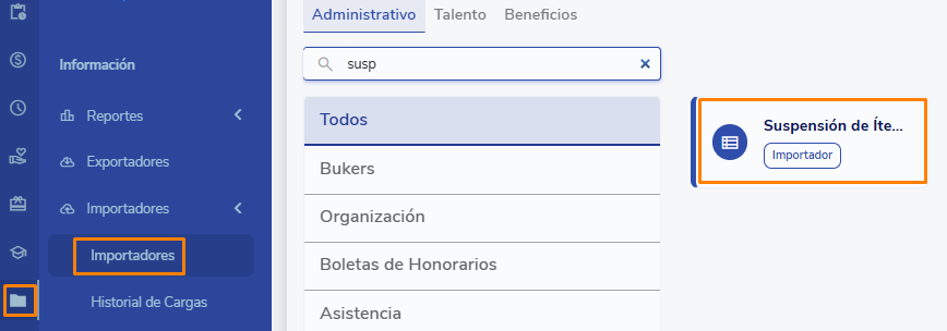 En caso de que desees realizar una suspensión masiva del APV, comienza accediendo al menú lateral Información, sección Importadores y, dentro de ella, haz clic en la opción Importadores. Una vez allí, presiona sobre el importador de Suspensión de Items y Créditos.