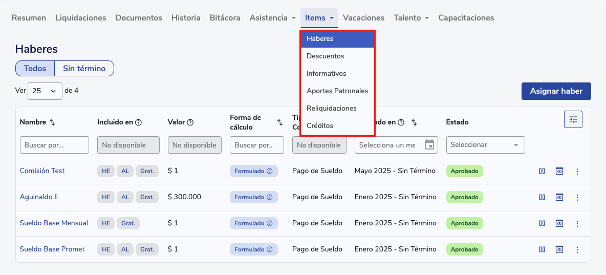 - Elige el tipo de ítem que deseas asignar (Haberes, Descuentos, informativos, etc), desde el menú desplegable
