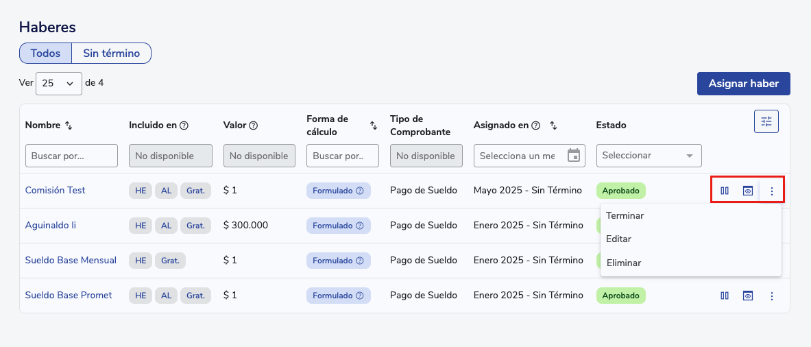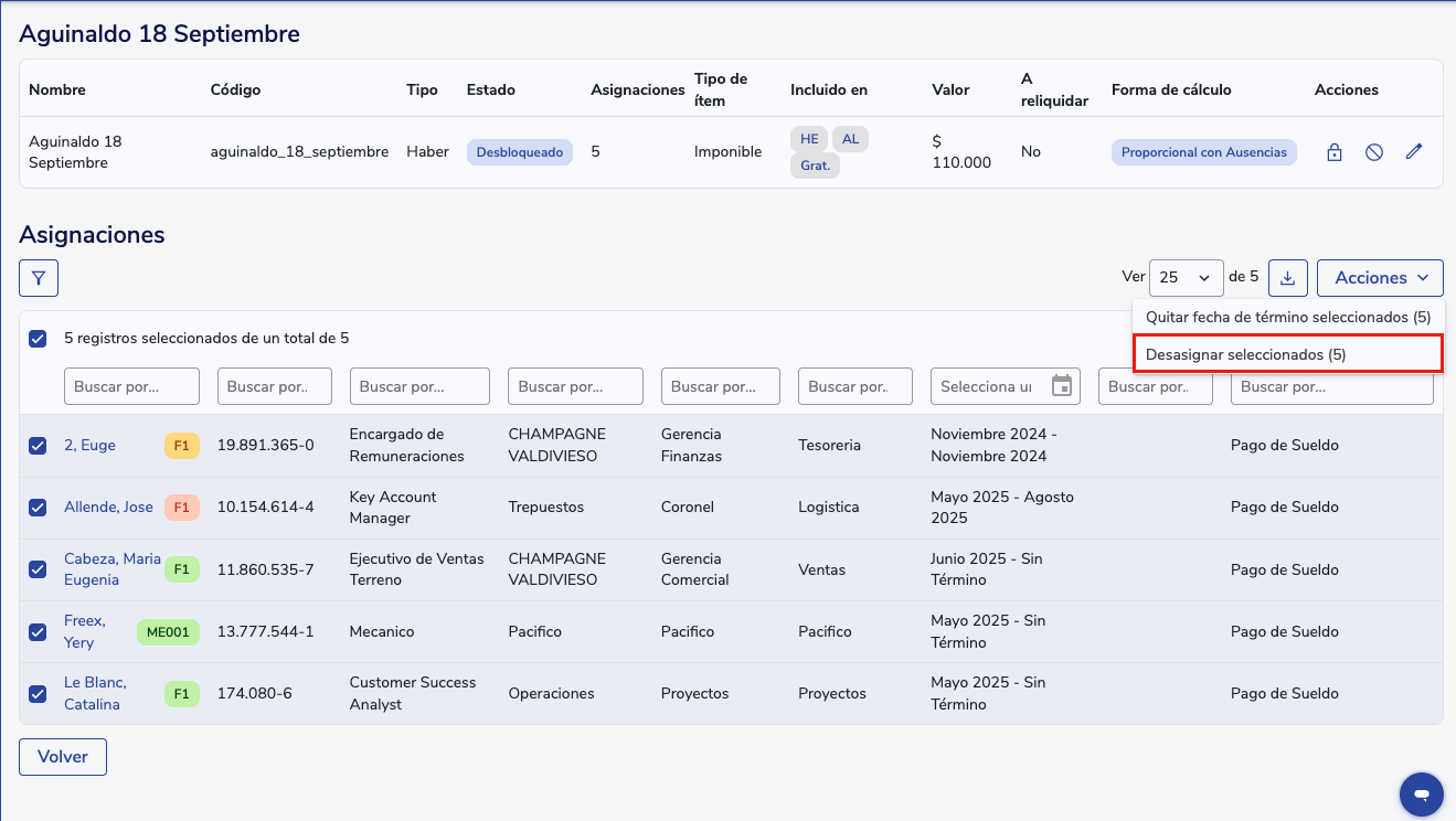 Otra forma de desasignar un ítem es desde la sección "Administrativo", opción "Ítems", desde donde puedes elegir entre "Haberes", "Descuentos", "Anticipos", "Aporte Patronal", "Informativos" y "Créditos" . En la casilla de ítem, selecciona el ítem que quieras desasignar, ya sea de forma individual o masiva. Marca a los colaboradores a los que deseas desasignar este ítem y luego, en la sección "Acciones", haz clic en "Desasignar seleccionados". De esta manera, podrás dar por terminados estos ítems.