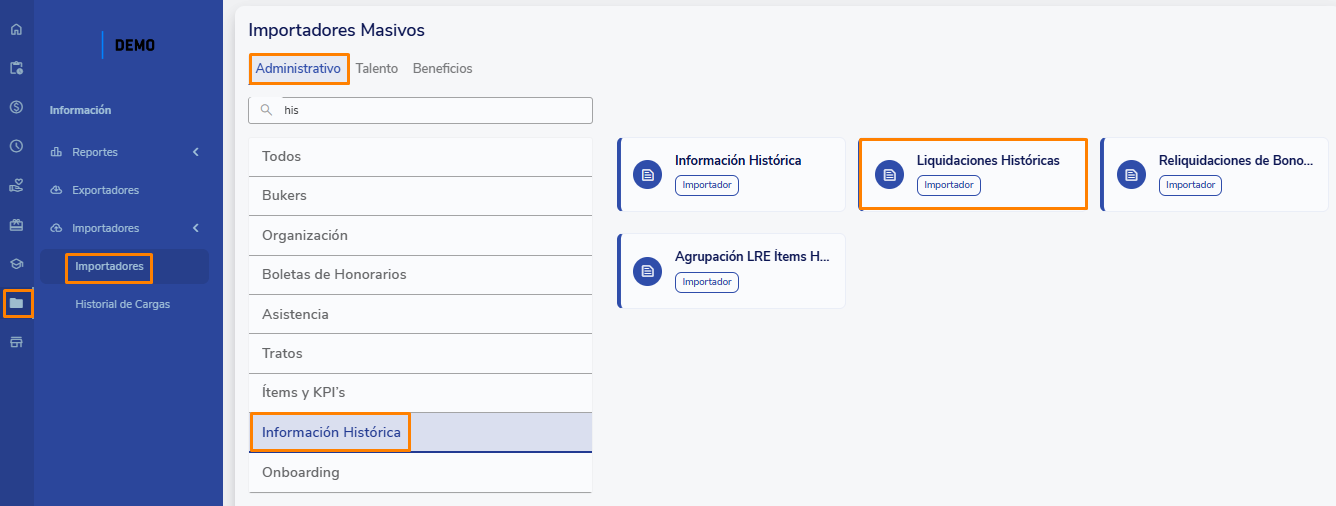 1. Dirígete al menú lateral Información, sección Importadores y luego haz clic en Importadores. En la pestaña Administrativo, dirígete a Información Histórica y escoge el importador Liquidaciones Históricas.