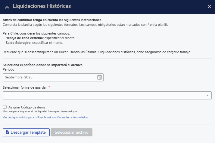 2. Se abrirá un modal en el que deberás seleccionar el periodo que cargarás los datos y la forma de guardar las liquidaciones. Una vez que completes esos datos, haz clic en Descargar Template.