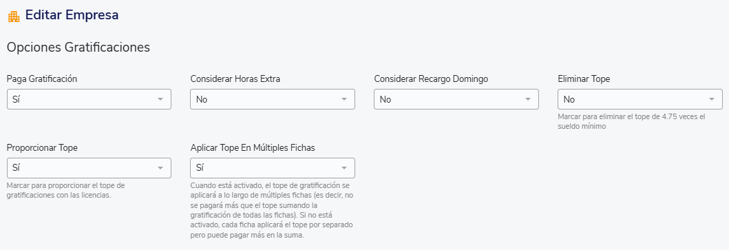 Podrás configurar todos los aspectos de cálculo en las "Opciones de Gratificaciones", las que podrás ubicar en los "Parámetros Generales" en la sección de "Empresas". Dentro de las opciones disponibles tendrás la libertad de editar aspectos como si utilizarás o no la gratificación que calcula el sistema, si considerarás o no horas extras, o si proporcionarás tope en caso de licencias. Recuerda que estas configuraciones se aplicarán si utilizas la gratificación de sistema, es decir, utilizando el cálculo automático de las remuneraciones afectas a gratificación que están en plataforma y cuando pagues el concepto de forma anticipada, mes a mes, mediante el cálculo del 25% de los ítems imponibles.