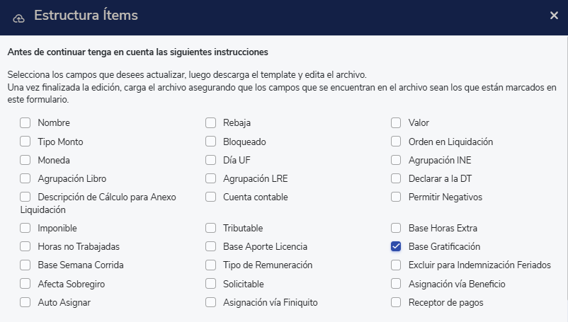 Proceso en Plataforma Masivo: Si pagarás el concepto mediante el cálculo del 25% de las remuneraciones imponibles, podrás configurar los ítems de forma masiva de modo que se incluyan dentro del cálculo de gratificación de los colaboradores, para ello puedes dirigirte hasta los Importadores y seleccionar el importador de "Estructura Ítems (modificador)" seleccionado la casilla de "Base Gratificación":