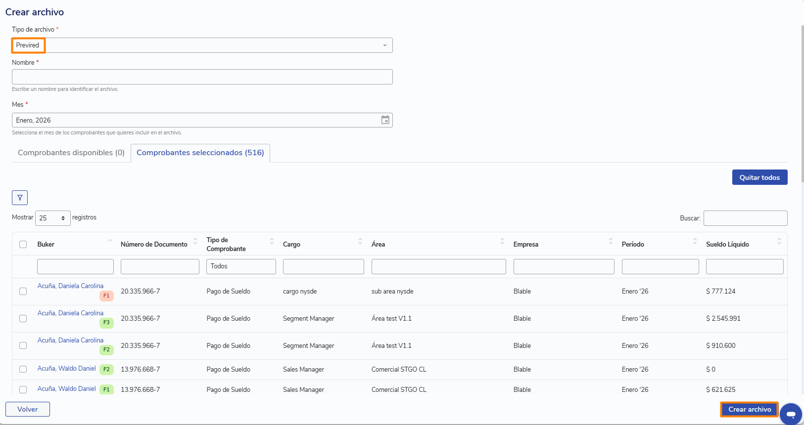 Selecciona los comprobantes que quieres incluir en el archivo y haz clic en Crear archivo.