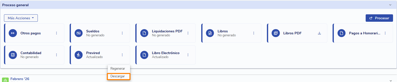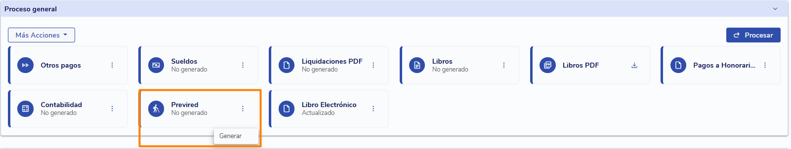 Dirígete al mes para el que quieres descargar el archivo y, en la sección Proceso General, ubica el cuadro Previred. Si no ha sido generado, haz clic en los tres puntos y luego en Generar.