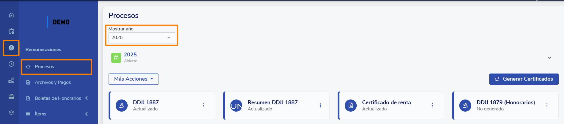 Inicio del Proceso: el proceso comienza seleccionando el año fiscal que vas a declarar. Para ello, dirígete al menú lateral "Remuneraciones" en Buk, donde encontrarás la sección "Procesos". Aquí podrás localizar y seleccionar el año correspondiente. Una vez hecho esto, haz clic en "Generar Certificados" para iniciar la generación de los archivos necesarios.