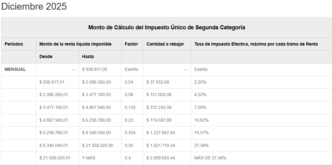 Base Tributable: calculada como el total de haberes imponibles menos los descuentos legales (tributables). Este resultado es la Base Tributable, el monto a buscar en la tabla de impuesto.