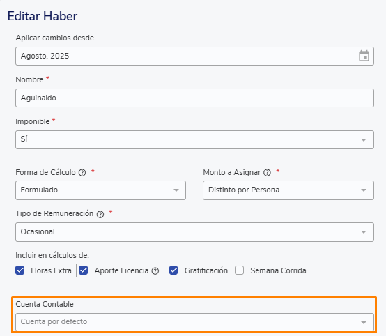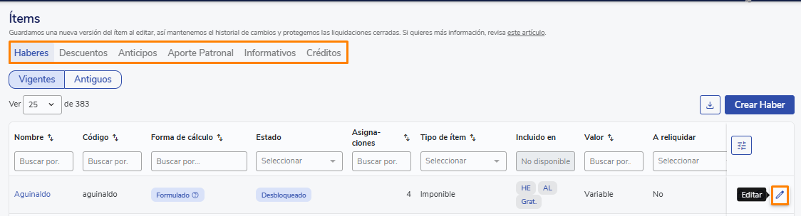 Allí verás las pestañas de Haberes, Descuentos, Anticipos, Aporte Patronal, Informativos y Créditos. Haz clic en la opción Editar del ítem al cual quieras asignar la cuenta contable.