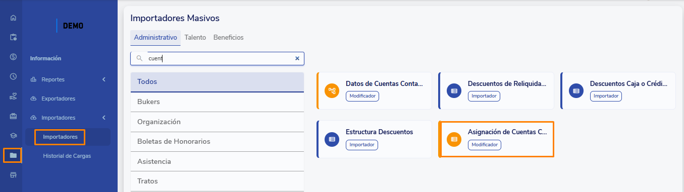 Debes dirigirte al menú Información, sección Importadores, y luego haz clic en Importadores. Allí, en la pestaña Administrativo, selecciona el modificador Asignación de Cuentas Contables a Ítem