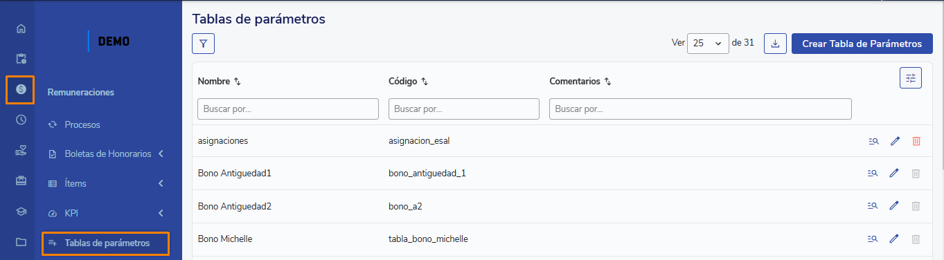 Una tabla en Buk solo podrá crearse estructuralmente de forma individual, para realizarlo debes dirigirte al menú lateral Remuneraciones, y luego a la sección. Tablas de parámetros de la plataforma.