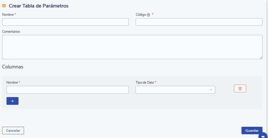 En esta visual encontrarás todas las tablas creadas previamente; para crear presiona sobre "Crear Tabla de Parámetros" e ingresa: