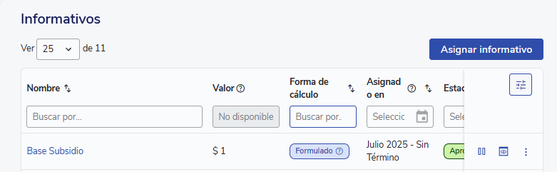 Una vez asignado, el ítem aparecerá en la tabla junto a los otros ítems asignados. En dicha tabla, verás los siguientes datos: Nombre, Valor, Forma de cálculo, Asignado en y Estado. La última columna contiene las siguentes acciones: