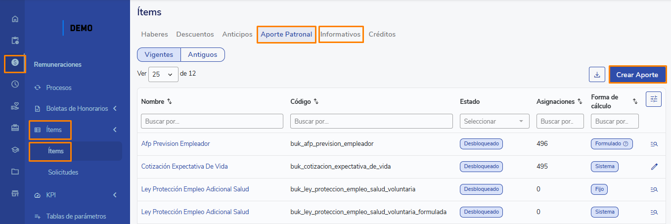 Tras haber configurado un ítem y si deseas modificar algún detalle, dirígete a "Remuneraciones". Luego, haz clic en "Ítems" y después en "Ítems". En la pestaña correspondiente, ya sea Aporte Patronal o Informativos, verás una tabla con todos los ítems vigentes. Esta tabla muestra el nombre, código, estado, asignaciones y forma de cálculo del ítem. La última columna contiene distintas acciones disponibles para cada ítem: