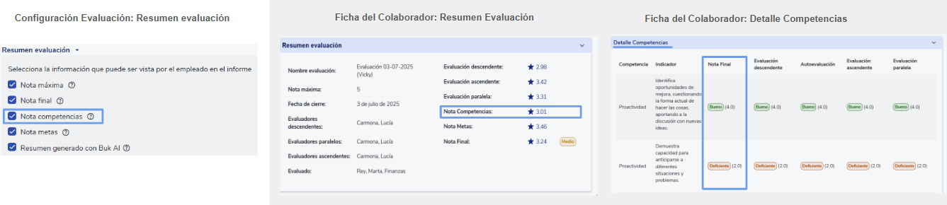 - Al deseleccionar el checkbox Nota competencias, se ocultará ese campo en la sección Resumen evaluación y también se ocultará la columna Nota Final dentro de la sección Detalle de competencias.