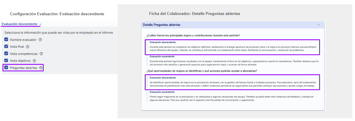 5. Al deseleccionar la casilla Preguntas abiertas, se ocultarán las respuestas de las preguntas abiertas correspondientes a este tipo de evaluación en la sección Detalle Preguntas abiertas.