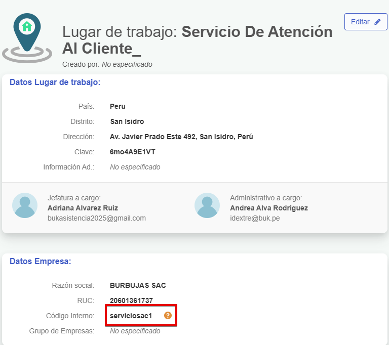 Allí podrás visualizar el código interno del recinto, el cual debe coincidir exactamente con el ingresado en Remuneraciones.