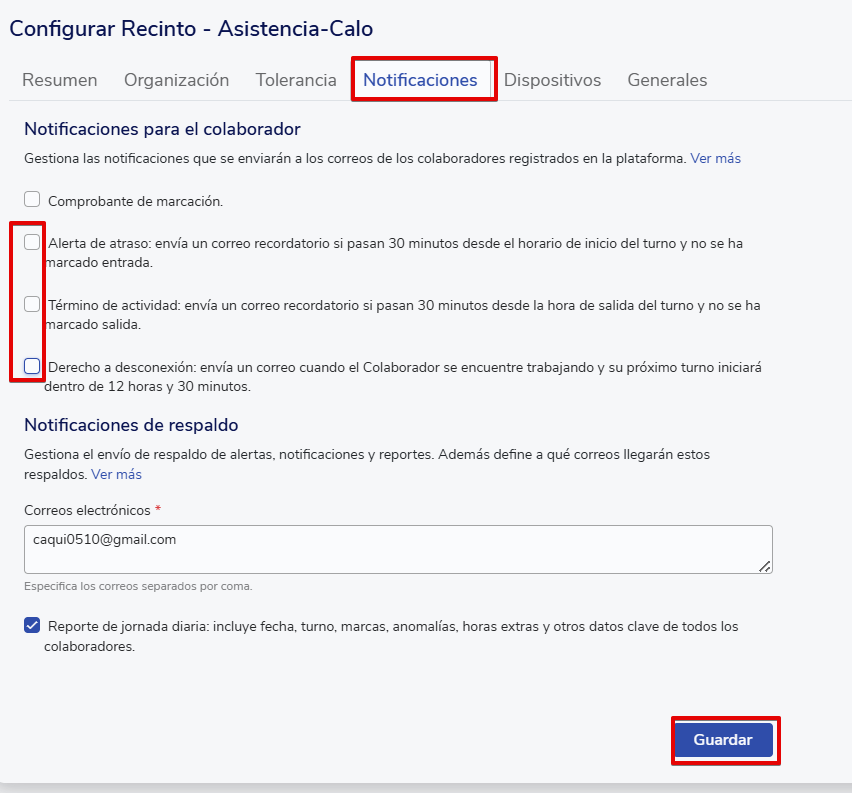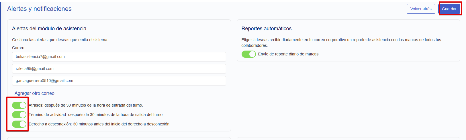 Ingresa a la tuerca de Administración → selecciona “Alertas y notificaciones” y, en la sección “Alertas del módulo de asistencia”, activa o desactiva las siguientes opciones: Atrasos, Término de jornada y Derecho a desconexión.
