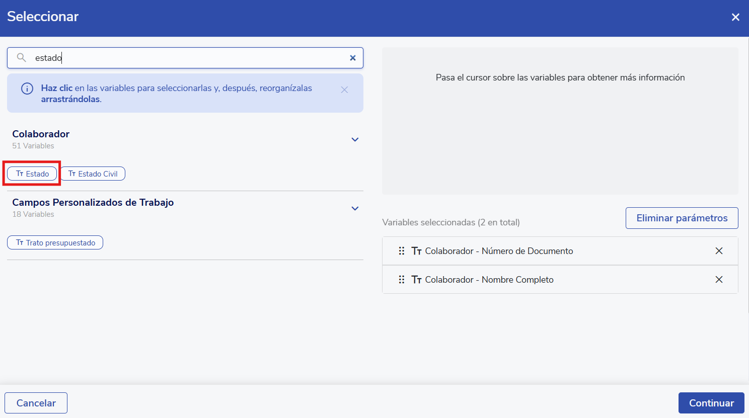 Agrega todas las variables que necesites, recordando agregar la variable Estado desde las variables de Colaborador.