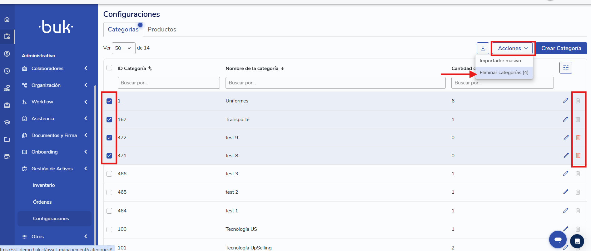 Para eliminar categorías en forma masiva debes: