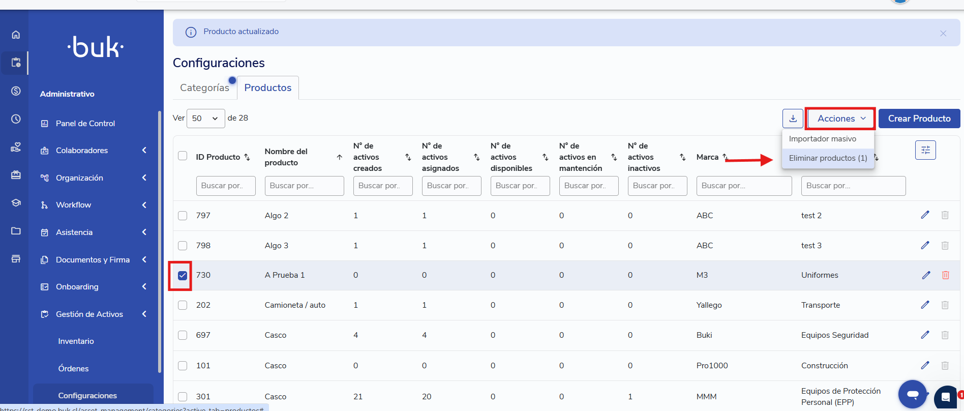 - Selecciona los productos a eliminar. Luego haz clic en Acciones > Eliminar Productos.