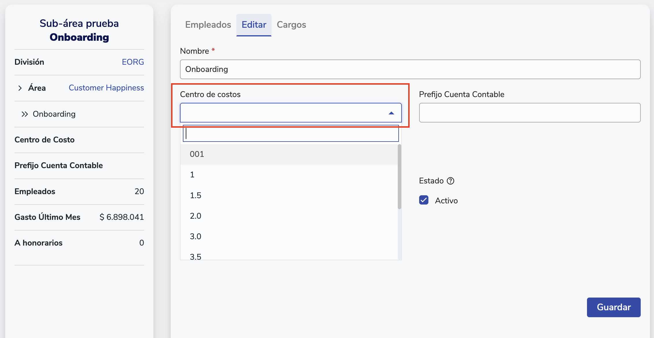 - En la pestaña Editar, asigna el Centro de Costo correspondiente y guarda los cambios.