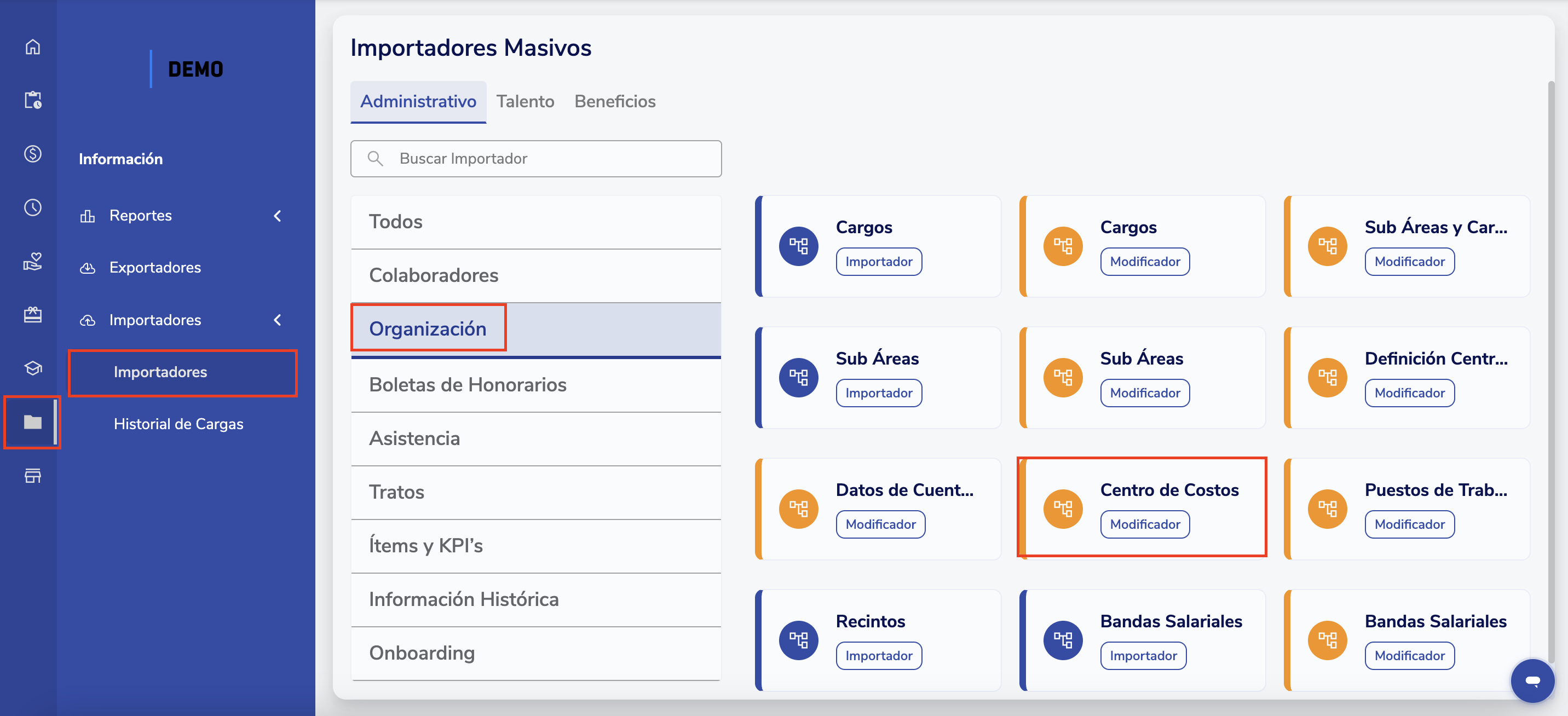 - En el menú superior lateral izquierdo, ve a Información > Importadores > Importadores > Administrativo > Organización > Centros de costo (Modificador).
