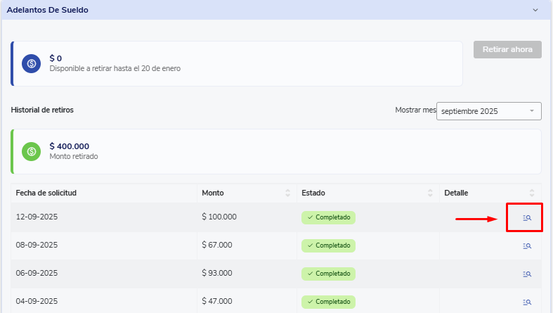 Al final de la página verás el historial de adelantos, con el estado de cada uno.