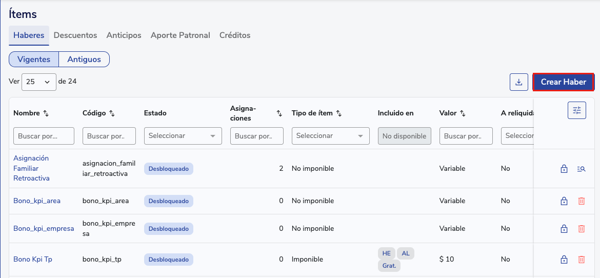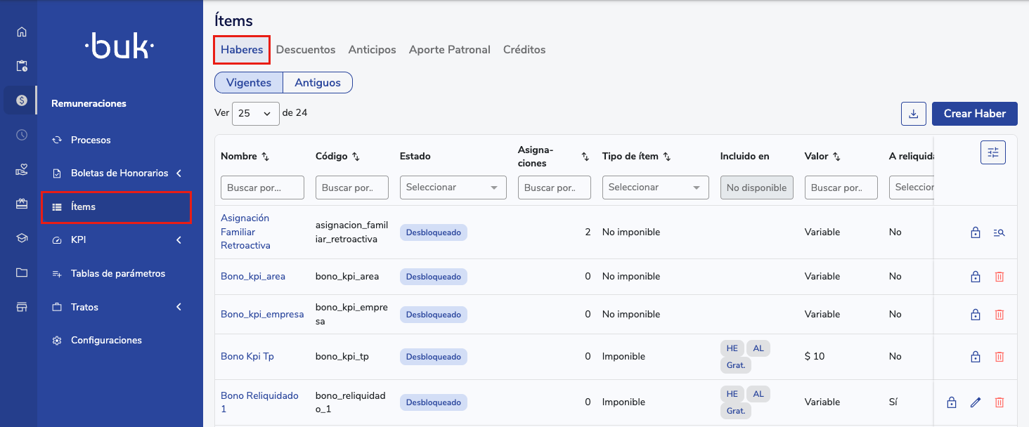 1. Dirígete al menú lateral Remuneraciones, sección Ítems y haz clic en el tab Haberes.